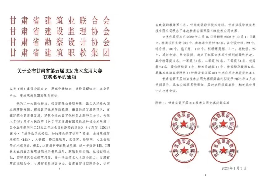 日前,甘肅省第五屆BIM技術(shù)應(yīng)用大賽結(jié)果公布,甘肅工程咨詢(xún)集團(tuán)共獲得14個(gè)獎(jiǎng)項(xiàng),其中,“BIM技術(shù)在東鄉(xiāng)縣沿洮河經(jīng)濟(jì)帶棚戶(hù)區(qū)改造二期(調(diào)整)項(xiàng)目設(shè)計(jì)階段的應(yīng)用”等8個(gè)項(xiàng)目分別獲設(shè)計(jì)組一、二、三等獎(jiǎng),“同心抗疫,智慧建造—甘肅省疾病預(yù)防控制中心公共衛(wèi)生中心項(xiàng)目BIM綜合應(yīng)用”等3個(gè)項(xiàng)目分別獲綜合組特等獎(jiǎng)及一、二等獎(jiǎng),“數(shù)字化轉(zhuǎn)型背景下的勘察設(shè)計(jì)企業(yè)BIM技術(shù)推廣路徑探究”等2個(gè)項(xiàng)目分別獲科研課題組二、三等獎(jiǎng),建筑設(shè)計(jì)院獲特殊貢獻(xiàn)獎(jiǎng)。