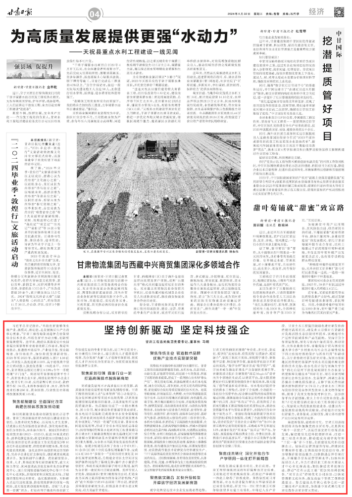 奮進(jìn)新征程,建功新時(shí)代。甘肅工程咨詢(xún)集團(tuán)將堅(jiān)持和加強(qiáng)黨的全面領(lǐng)導(dǎo),認(rèn)真落實(shí)“兩個(gè)一以貫之”,以高質(zhì)量黨建引領(lǐng)高質(zhì)量發(fā)展,錨定建設(shè)先進(jìn)科技創(chuàng)新體系、打造一流工程技術(shù)集團(tuán)、推動(dòng)建成高端咨詢(xún)智庫(kù)“三位一體”奮斗目標(biāo),全面建設(shè)現(xiàn)代科技創(chuàng)新企業(yè)。加快推進(jìn)管理提升行動(dòng),持續(xù)深化管理標(biāo)桿創(chuàng)建;加快推進(jìn)價(jià)值創(chuàng)造行動(dòng),著力增強(qiáng)價(jià)值創(chuàng)造能力;加快推進(jìn)品牌引領(lǐng)行動(dòng),不斷提升品牌運(yùn)營(yíng)管理水平;加快培養(yǎng)高層次人才,全力打造西北工程技術(shù)重要人才中心和創(chuàng)新高地;加快推進(jìn)改革創(chuàng)新行動(dòng),推動(dòng)“改革示范工程”更加突出科技屬性、“雙百企業(yè)”持續(xù)優(yōu)化公司治理;加快完善創(chuàng)新文化體系,激發(fā)提振干部職工創(chuàng)新創(chuàng)造活力。努力建設(shè)具有核心競(jìng)爭(zhēng)力的一流工程技術(shù)產(chǎn)業(yè)集團(tuán),為推進(jìn)中國(guó)式現(xiàn)代化甘肅實(shí)踐作出新的更大貢獻(xiàn)。