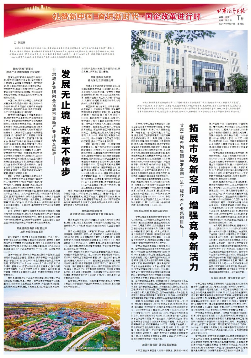 奮進新征程,甘肅工程咨詢集團將全面貫徹落實黨的二十屆三中全會精神,準確把握改革重點任務(wù),持續(xù)推動國有企業(yè)做強做優(yōu)做大,著力提升改革質(zhì)量和效能,不斷推進黨的建設(shè)與生產(chǎn)經(jīng)營深度融合,聚焦勘察設(shè)計主業(yè),大力發(fā)展綠色技術(shù)、數(shù)字技術(shù)等新興產(chǎn)業(yè),加快培育新質(zhì)生產(chǎn)力,增強高質(zhì)量發(fā)展動能,加快建設(shè)全國一流工程技術(shù)產(chǎn)業(yè)集團。