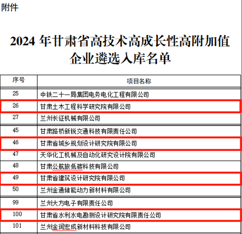近日,甘肅省科技廳公布2024年甘肅省高技術高成長性高附加值(簡稱“三高”)企業(yè)名單,甘肅工程咨詢集團旗下省建筑設計院、省水電設計院、省城鄉(xiāng)規(guī)劃院、甘肅土木工程院從眾多企業(yè)中脫穎而出,成功登上全省首批“三高”企業(yè)榜單。