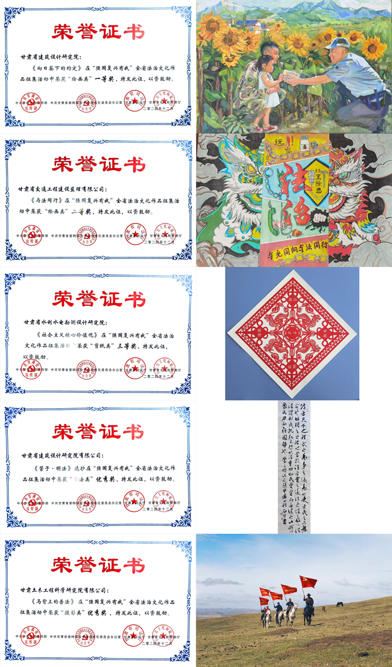 經(jīng)評選,集團多件作品脫穎而出。省建筑設(shè)計院的《向日葵下的約定》以細(xì)膩筆觸和獨特視角,獲繪畫類一等獎;省交通監(jiān)理公司的《與法同行》生動展現(xiàn)法治守護,獲繪畫類二等獎;省水電設(shè)計院的《社會主義核心價值觀》以精湛剪紙技藝,獲剪紙類三等獎;省建筑設(shè)計院的《〈管子·明法〉選抄》獲書法類優(yōu)秀獎;甘肅土木工程院的《馬背上的普法》獲攝影類優(yōu)秀獎。