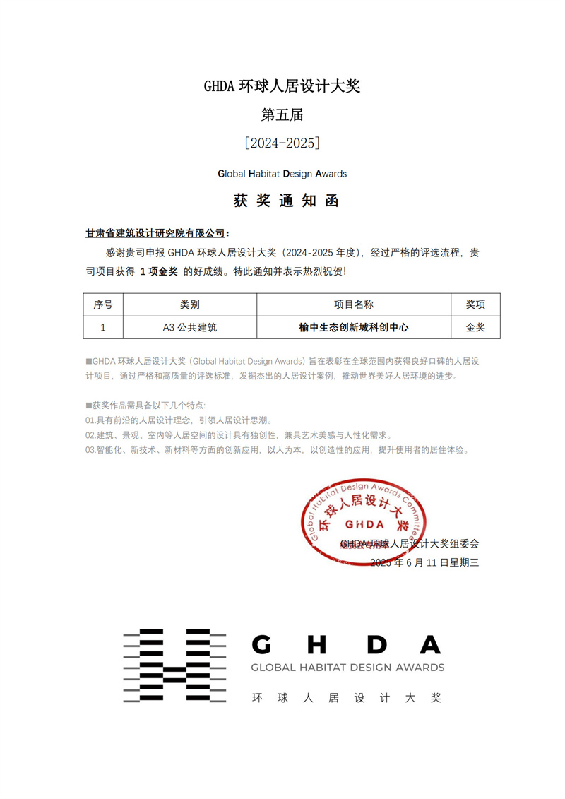 近日,備受矚目的第五屆GHDA環(huán)球人居設(shè)計大獎獲獎名單揭曉。甘肅工程咨詢集團旗下省建筑設(shè)計院精心打造的榆中生態(tài)創(chuàng)新城科創(chuàng)中心項目,繼榮獲美國綠色建筑委員會頒發(fā)的LEED V4 BD+C鉑金級預(yù)認(rèn)證、中國綠色建筑三星級預(yù)評價兩項權(quán)威認(rèn)證后,再度摘得公共建筑類金獎,彰顯出我省在人居設(shè)計領(lǐng)域的卓越實力。