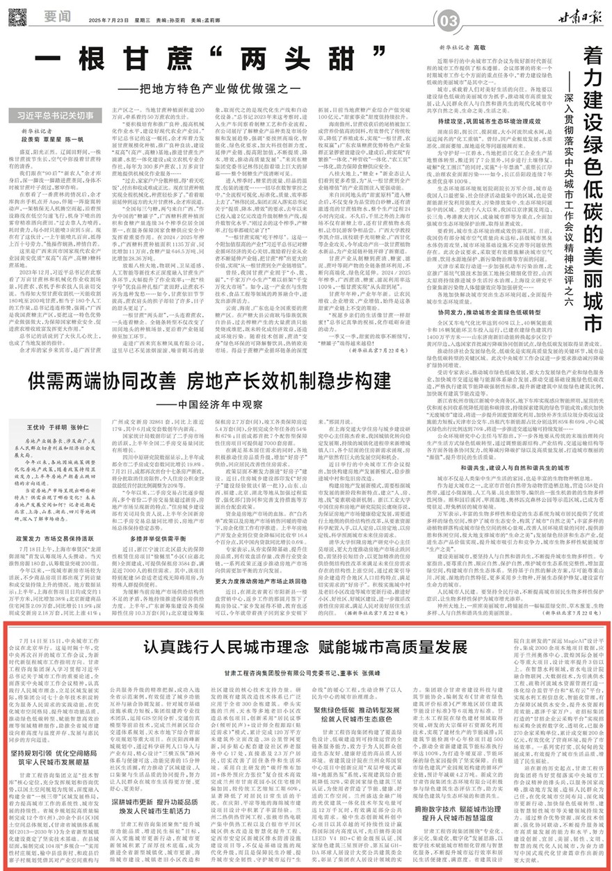 7月14日至15日,中央城市工作會議在北京舉行。這是時隔十年,黨中央再次召開的城市工作會議,為新時代新征程城市工作指明方向。甘肅工程咨詢集團深入學習貫徹習近平總書記關(guān)于城市工作的重要論述,全面落實中央城市工作會議精神,認真踐行人民城市理念,立足區(qū)域發(fā)展實際,將集團公司七十余年技術(shù)積淀轉(zhuǎn)化為服務(wù)人民需求的實踐動能,在優(yōu)化城市空間格局、提升城市功能品質(zhì)、推動綠色低碳轉(zhuǎn)型、賦能智慧高效治理等領(lǐng)域精耕細作,助推全省城市建設(shè)向著高度與溫度并存、發(fā)展與惠民同步的方向邁進。