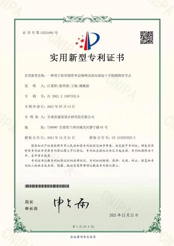 近日,從國(guó)家知識(shí)產(chǎn)權(quán)局傳來(lái)好消息,由建筑設(shè)計(jì)院總工程師張舉濤、設(shè)計(jì)四所總工程師江重陽(yáng)、設(shè)計(jì)五院總工程師王棟、設(shè)計(jì)四所工程師姚佩歆聯(lián)合申報(bào)的“一種用于矩形鋼管單層鋼網(wǎng)殼的內(nèi)部加十字肋圓筒形節(jié)點(diǎn)”技術(shù),喜獲國(guó)家實(shí)用新型專利。