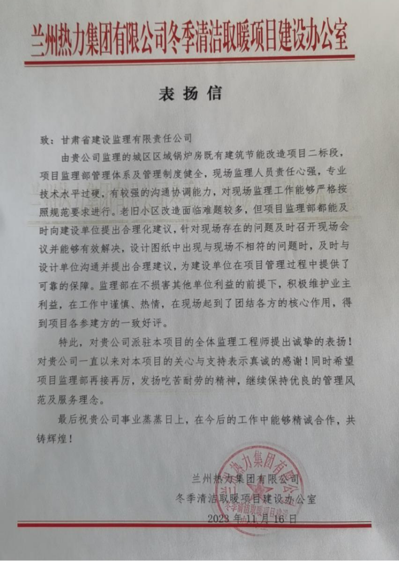 近日,省建設(shè)監(jiān)理公司收到蘭州熱力集團(tuán)有限公司冬季清潔取暖項目建設(shè)辦公室發(fā)來的表揚(yáng)信,對省建設(shè)監(jiān)理公司城區(qū)區(qū)域鍋爐房既有建筑節(jié)能改造項目二標(biāo)段監(jiān)理部全體人員表示感謝。