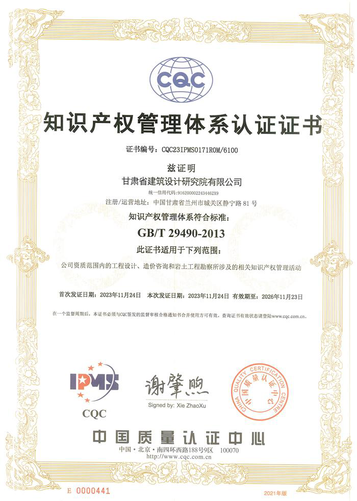 近日,省建筑設(shè)計院收到由中國質(zhì)量認證中心頒發(fā)的編號為CQC23IPMS0171ROM/6100的《知識產(chǎn)權(quán)管理體系認證證書》,標志著省建筑設(shè)計院知識產(chǎn)權(quán)管理體系完全符合GB/T 29490-2013標準,這是省建筑設(shè)計院在國家層面知識產(chǎn)權(quán)領(lǐng)域取得的重要認可,進一步提升了省建筑設(shè)計院的綜合競爭力。