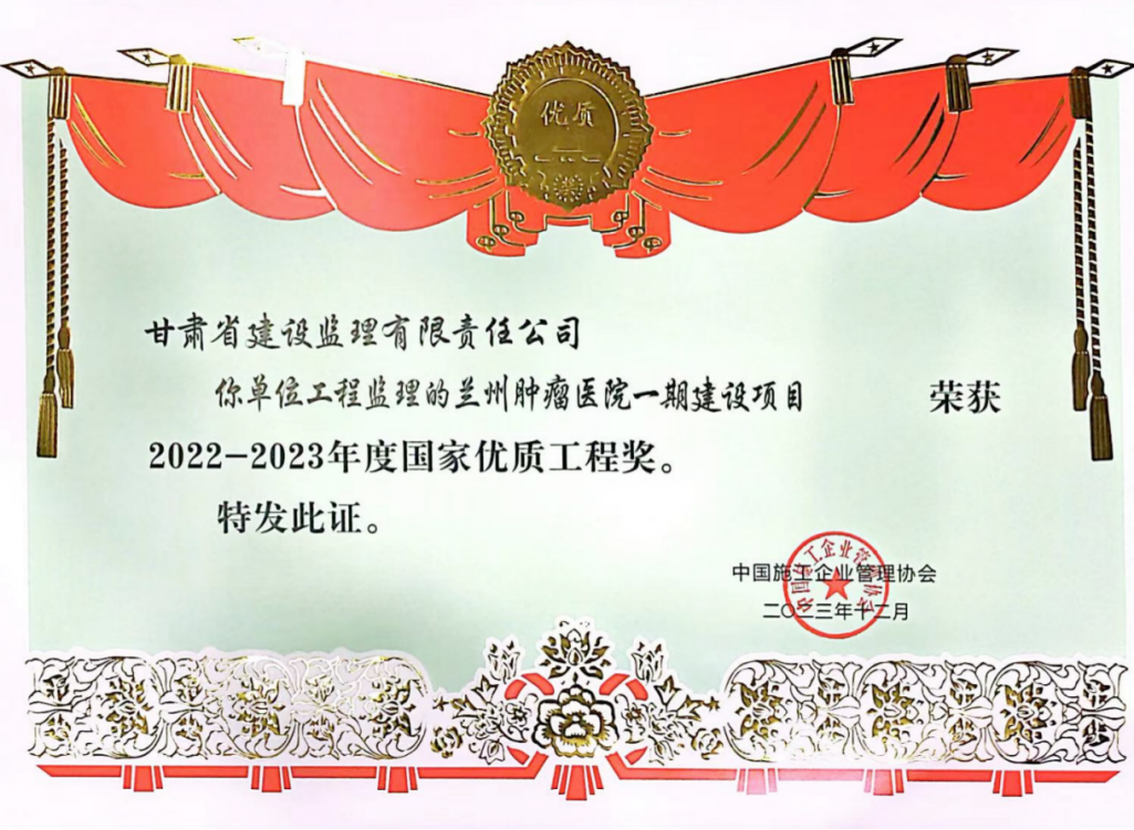 近日,經中國施工企業(yè)管理協(xié)會評審,省建設監(jiān)理公司監(jiān)理的蘭州腫瘤醫(yī)院一期建設項目榮獲2022-2023年度國家優(yōu)質工程獎。此前,該項目已先后榮獲甘肅省建設工程文明工地、2021-2022年度甘肅省建設工程飛天獎、2022-2023年度國家優(yōu)質工程獎。