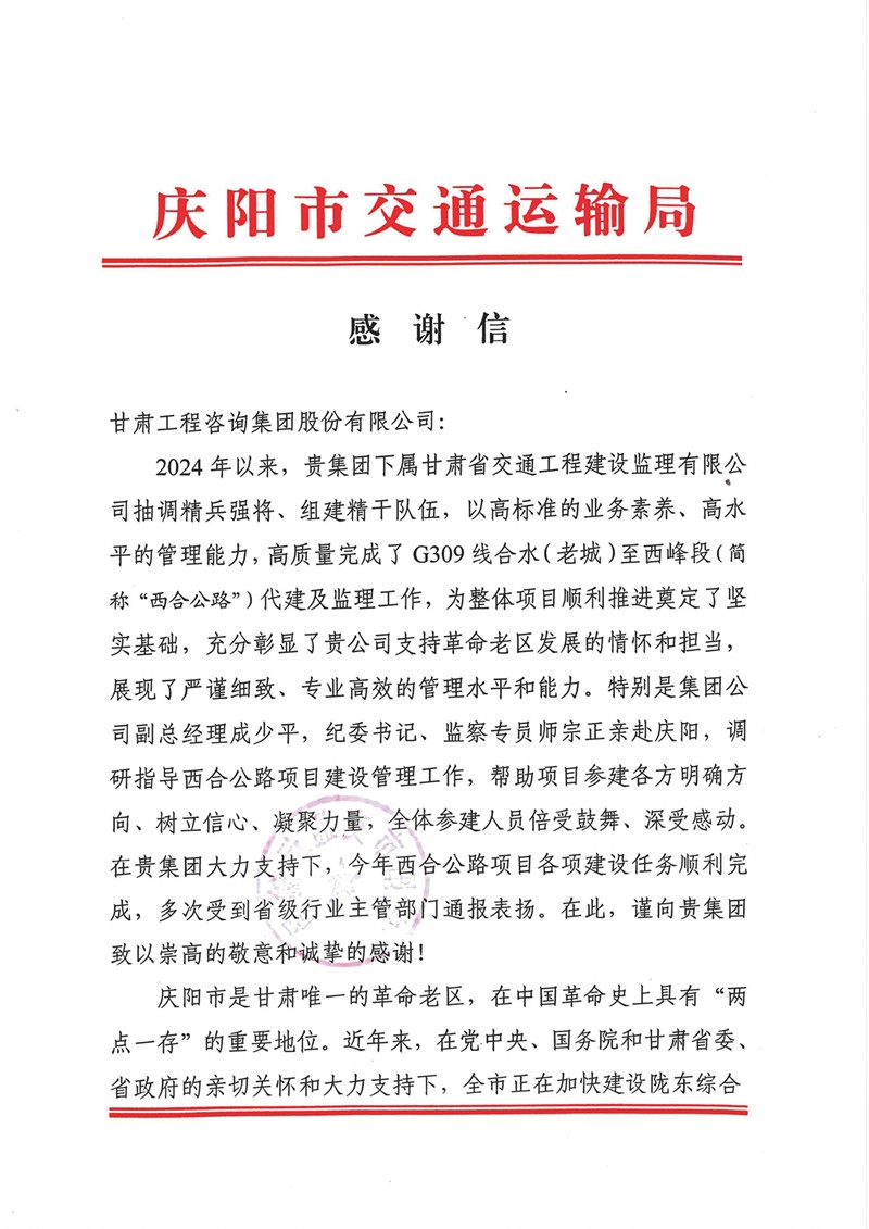 12月30日,甘肅工程咨詢集團(tuán)收到慶陽市交通運(yùn)輸局的感謝信,向省交通監(jiān)理公司在G309線合水(老城)至西峰段公路項(xiàng)目建設(shè)過程中作出的貢獻(xiàn)表示感謝。