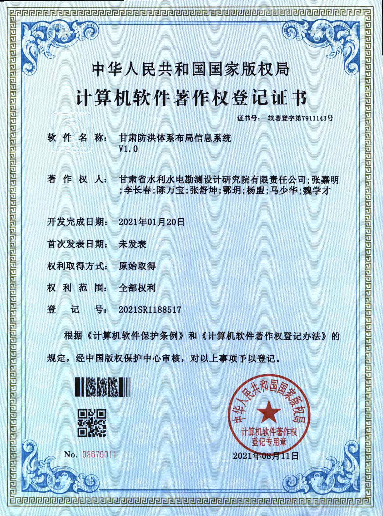 軟著登記證書——甘肅防洪體系布局信息系統(tǒng)